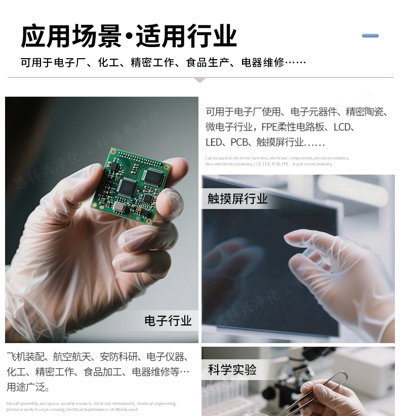 适用于食品、医疗、半导体、LCD、精密光学等行业。
