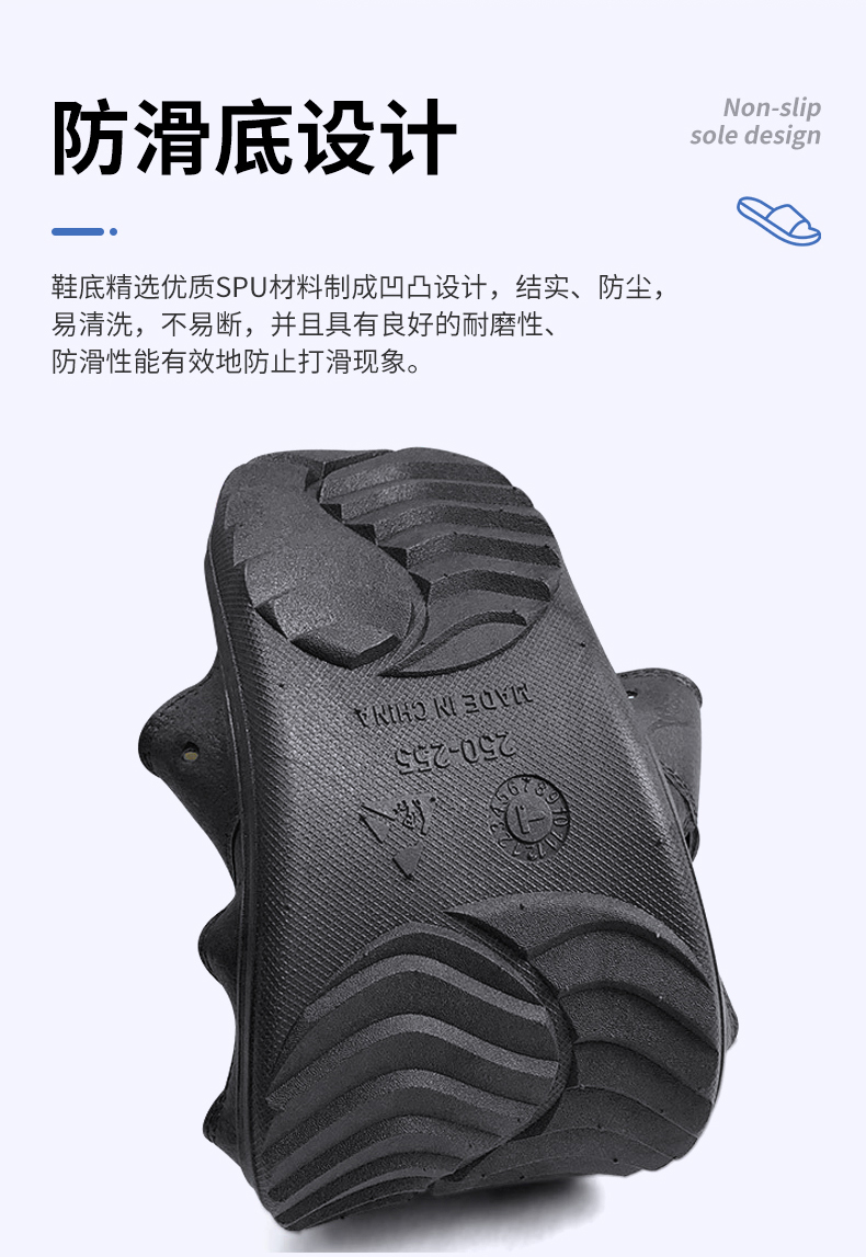 SPU 材质优势,耐用易维护: SPU 材质的优异特性,产品兼具良好弹性与强耐磨、防滑性能,行走时贴合脚部更舒适;可直接清洗,清洗后不易出现磨损、变形问题,使用寿命更长。