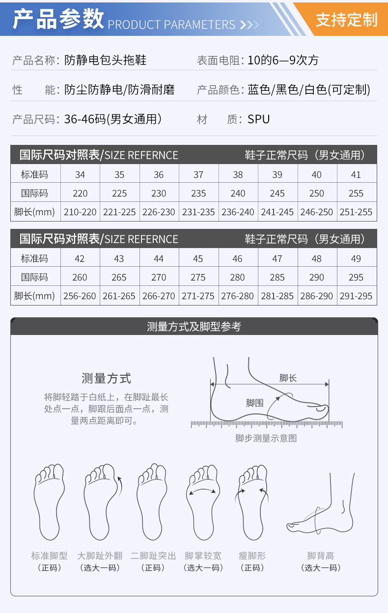 高效防静电,性能稳定:通过特殊导静电工艺,可将人体积聚的静电荷高效导入大地,有效消除静电;产品表面电阻值稳定保持在 10⁶-10⁸Ω 区间,符合防静电性能标准,能持续满足静电敏感环境的防护需求。